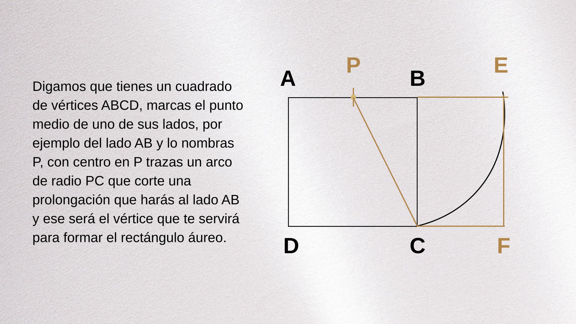 Otra forma también muy sencilla de crear el rectángulo áureo es a partir de un cuadrado cualquiera. Digamos que tienes un cuadrado de vértices ABCD, marcas el punto medio de uno de sus lados, por ejemplo del lado AB y lo nombras P, con centro en P trazas un arco de radio PC que corte una prolongación que harás al lado AB y ese será el vértice que te servirá para formar el rectángulo áureo.