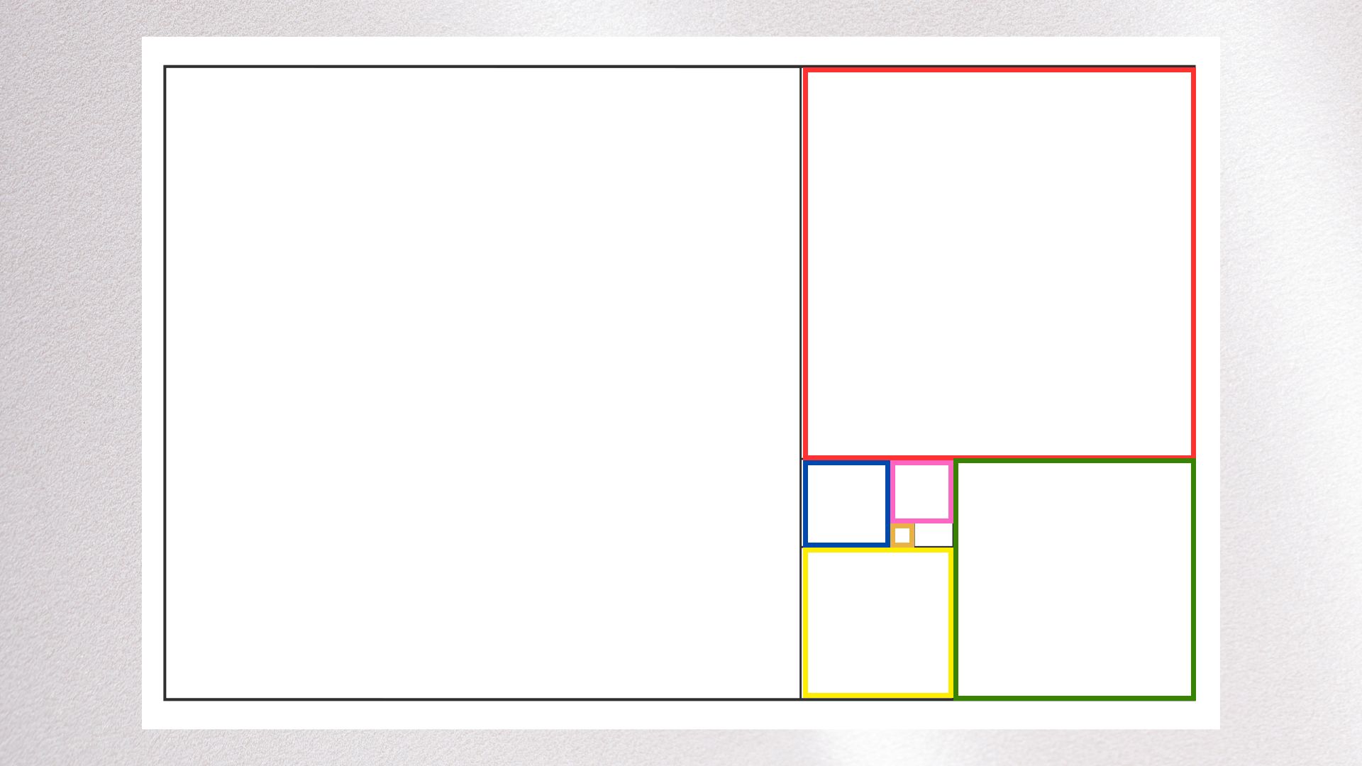 En uno de los extremos del rectángulo áureo vamos a crear un cuadrado de lado igual al número que sigue al número que corresponde al lado más pequeño de nuestro rectángulo áureo, en la secuencia de Fibonacci. Y nos habrá quedado dividido el rectángulo áureo original en un cuadrado y otro rectángulo áureo más pequeño. Repitiendo esta operación podremos dividirlo cuantas veces queramos.