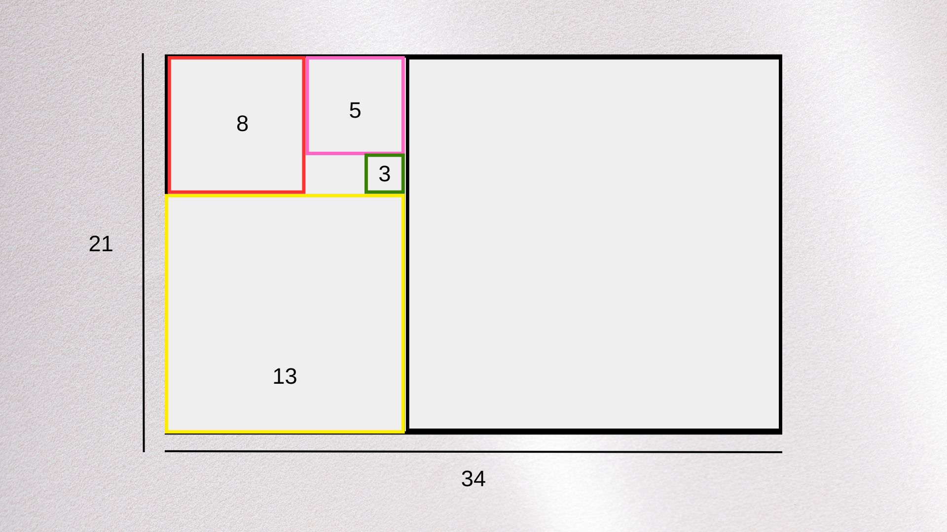 Construimos un rectángulo áureo en el que sus lados van a ser dos números consecutivos de la secuencia de Fibonacci.