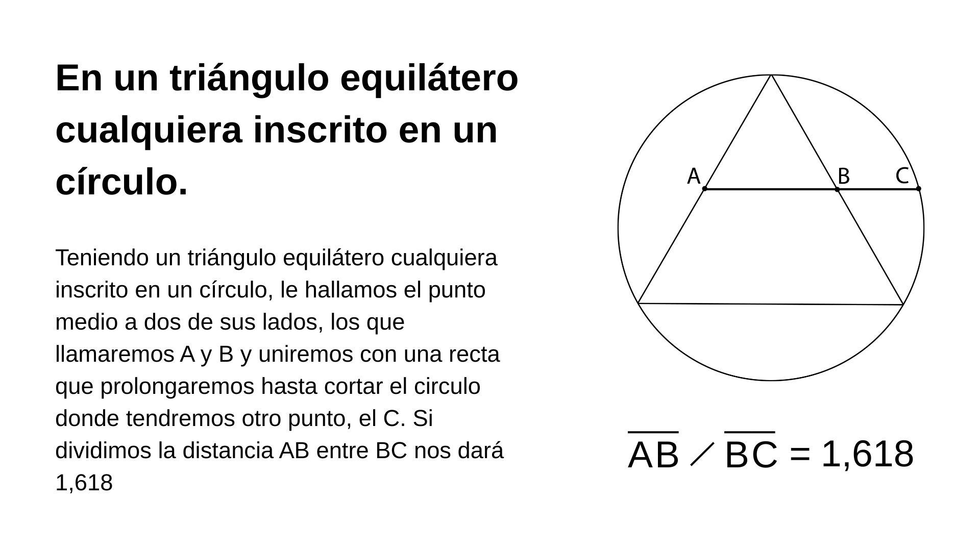 Lo que quiere decir que, si tenemos un rectángulo de vértices ABCD, en el que AB es el lado largo y BC el lado corto deberá cumplirse que AB/BC = 1,618 para que guarden proporción aurea entre sí.
