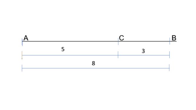 Por ejemplo: si AB es igual a 8, AC tendría que ser aproximadamente igual a 5 y CB a 3 para que estén en proporción aurea.